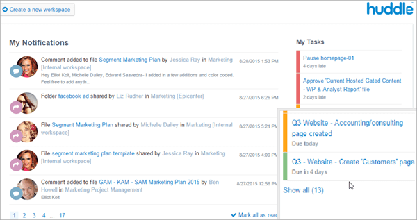 A Huddle is a listánk legtetején áll, egyszerűen azért, mert nem csak egy ügyfélportál; ez az egyik legjobb portál szoftver megoldás a piacon. Ennél is fontosabb, hogy a Huddle sikeresen ötvözi az ügyfélkapcsolatot a dokumentumkezeléssel, lehetővé téve a felhasználók számára, hogy intranetes munkaterületeket hozzanak létre a csapatok, partnerek és ügyfelek számára.