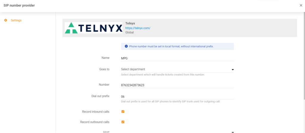 Egyszerűen lépjen a Konfigurációk > Hívás > Számok > Telnyx-re. Adja hozzá a VoIP-számot, és azonnal használhatja.