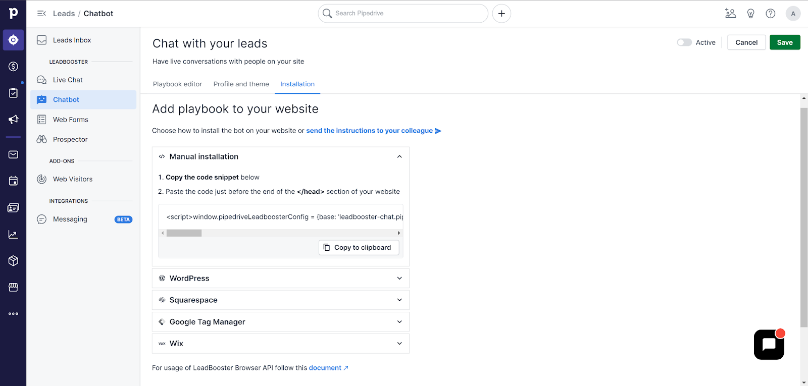 Bár őszintén mondhatom, hogy a PipeDrive áramlási funkciói nagyon jól megtervezettek, kár, hogy az alkalmazás lényegében chatbot használatára kényszerít. A PipeDrive chatbotot egy külön áttekintésben fogjuk megvizsgálni, ezért maradjunk a PipeDrive élő chat megvalósításán. Ha elégedett a folyamattervvel, kiválaszthatja a Telepítés lapot, és különféle lehetőségek közül választhat, beleértve a WordPress, a Squarespace, a Google Címkekezelő, a Wix vagy a kézi telepítést. Az áttekintés céljára a kézi telepítést választottam.