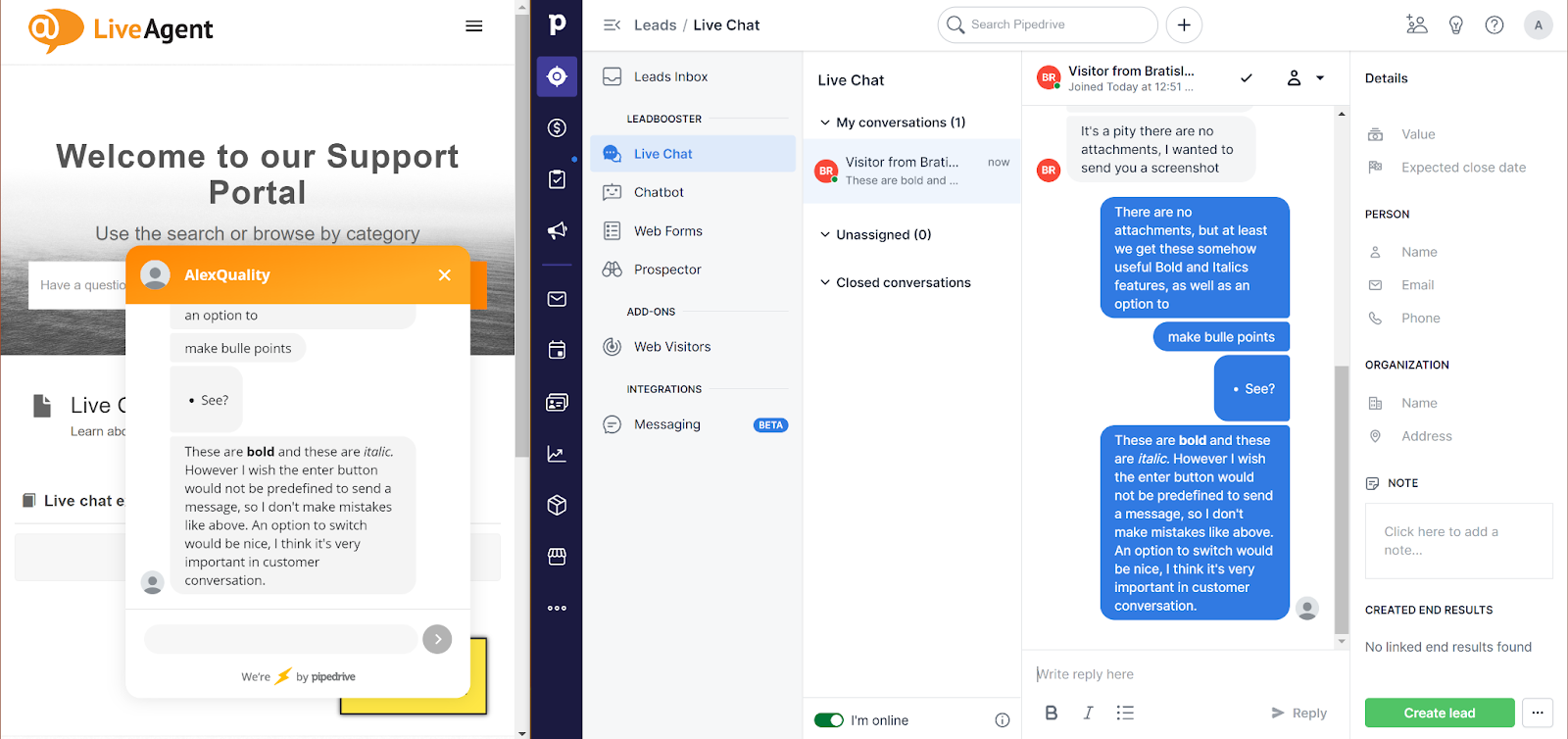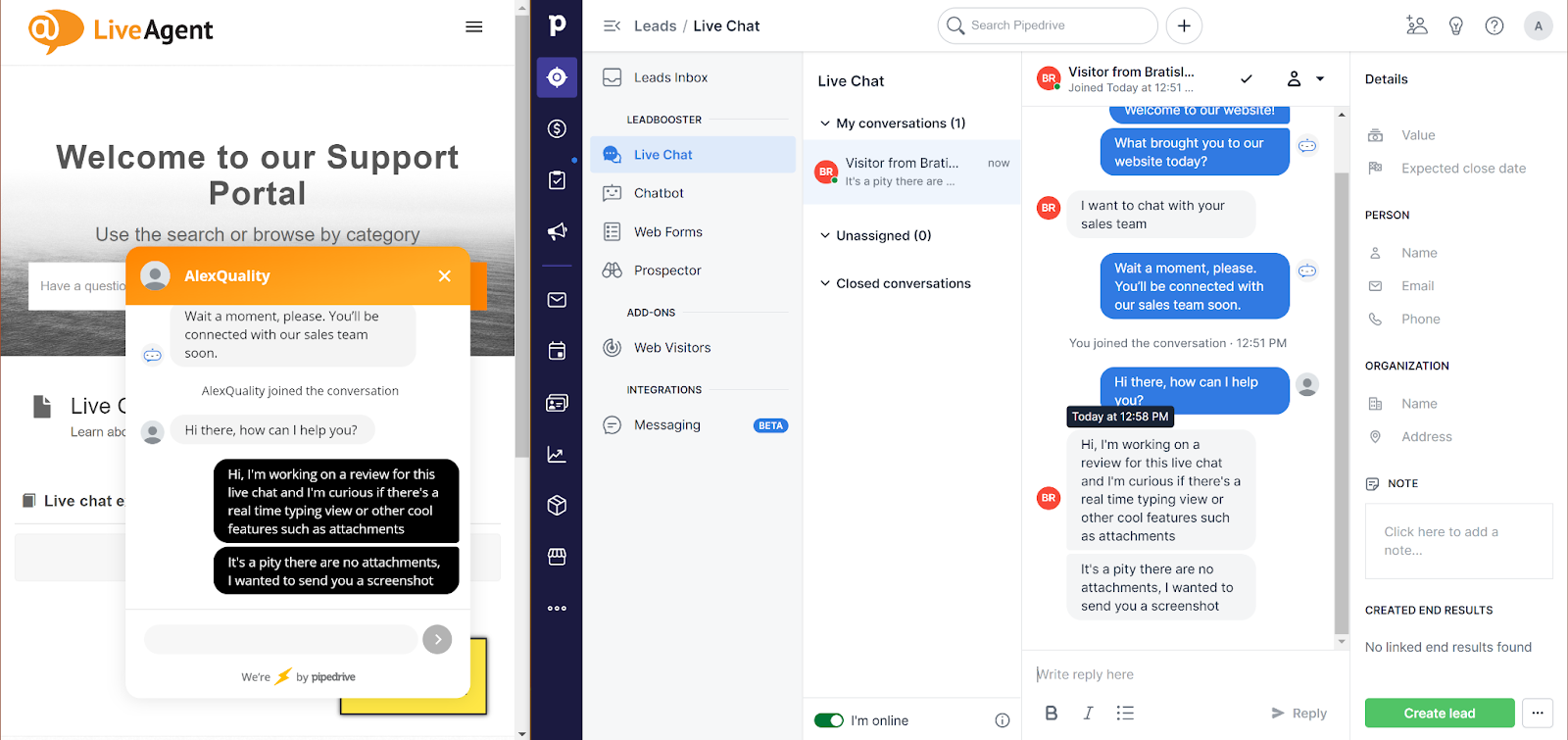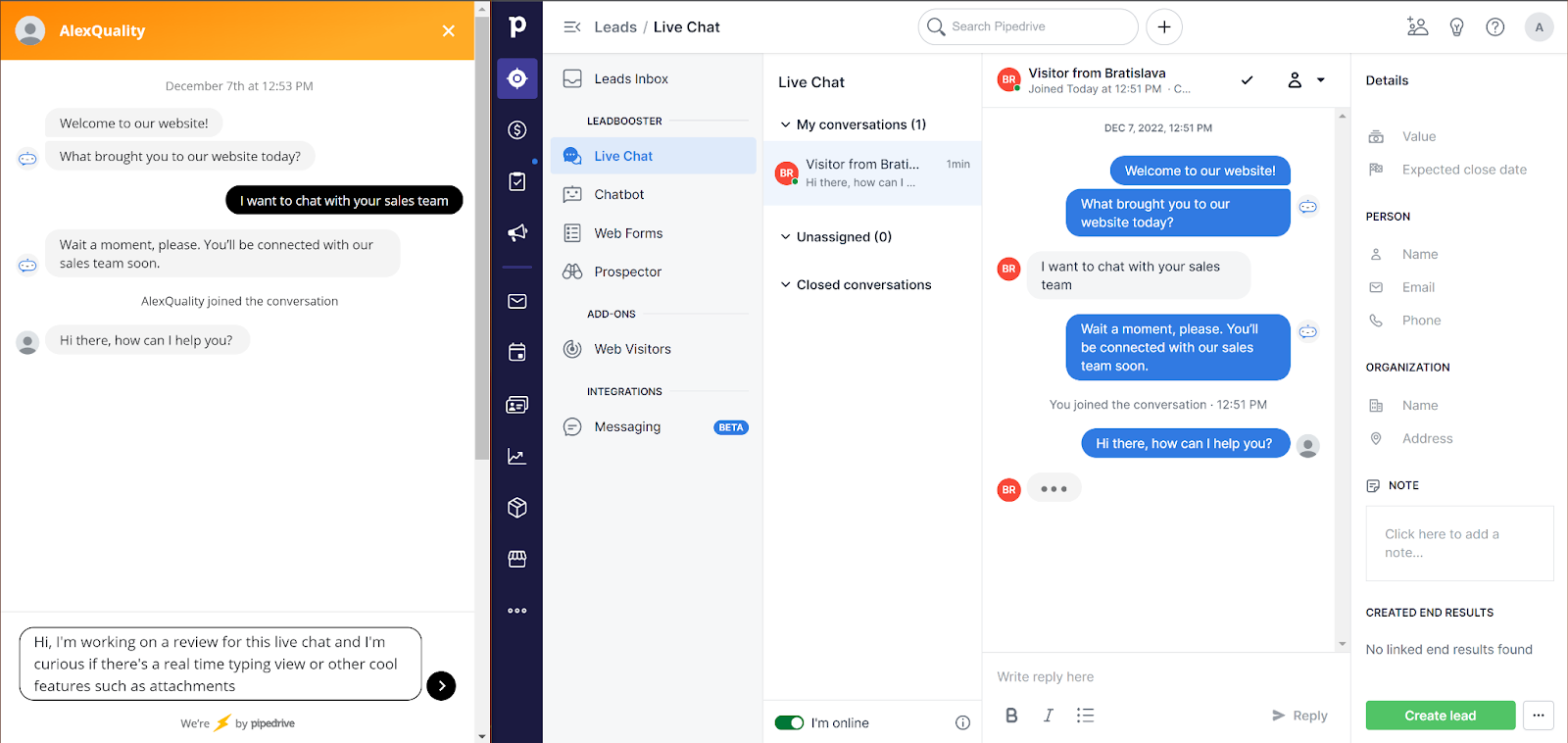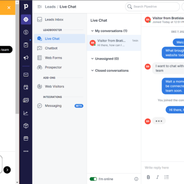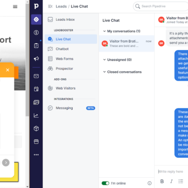 A PipeDrive webhelye nem tartalmazza a rendelkezésre álló élő csevegési funkciókat, kivéve a chatbotot és a CRM eszközkészlet többi részével való integrációt a további potenciális ügyfelek előállításához. A következő rész bemutatja a PipeDrive élő chattel való munkavégzés tapasztalatait mindkét oldalról, és végigmegyünk az összes elérhető funkción.