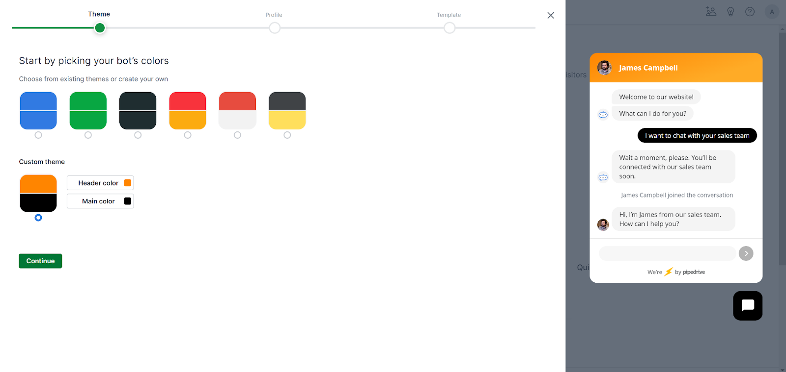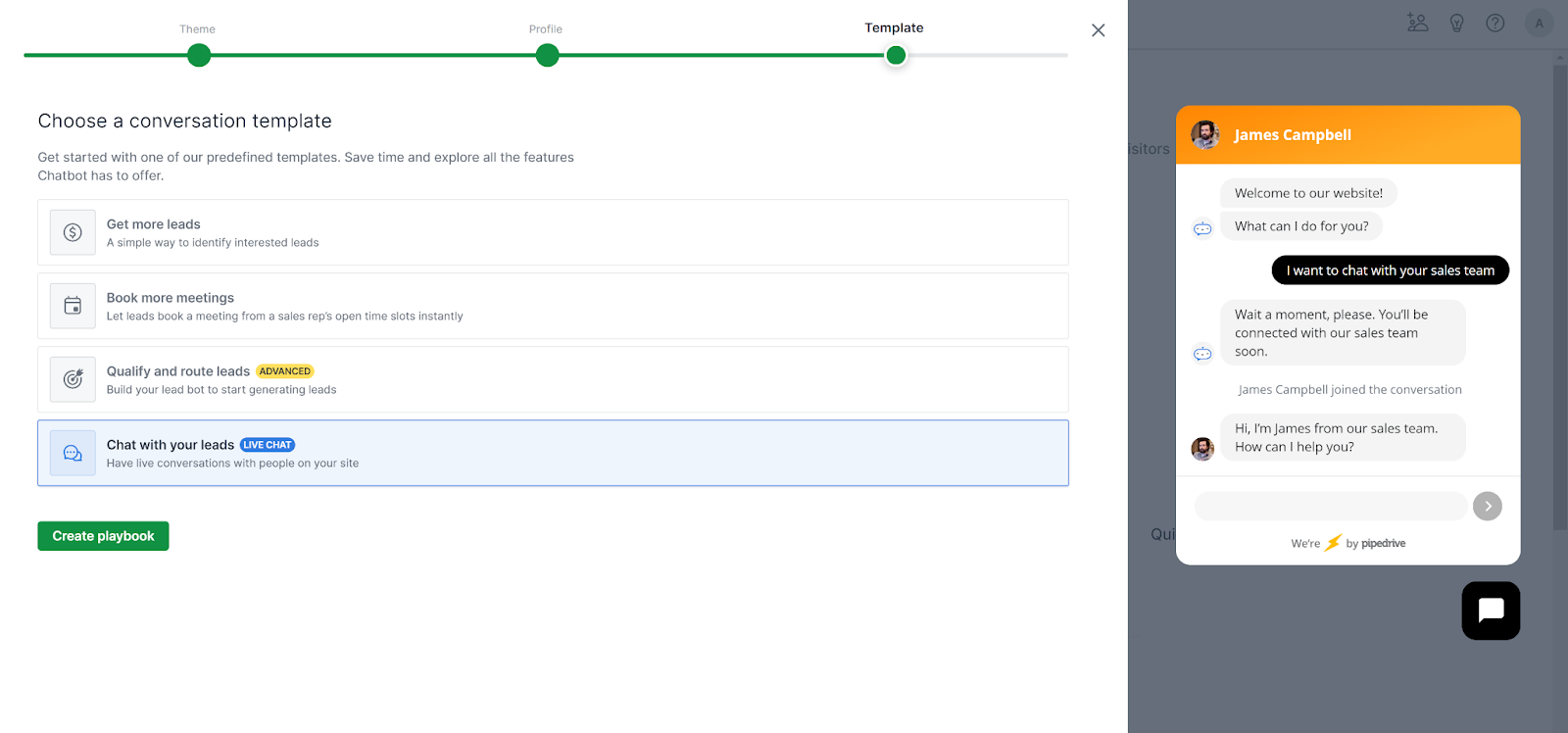 A következő részben a PipeDrive kötelezően meg fogja kérni a chatbot meghatározását (még akkor is, ha nem akarja). A szakasz ezt követően megkérdezi az élő csevegés célját, és kiválaszthatja, hogy szeretne-e több leadet generálni, több találkozót szeretne-e lefoglalni, vagy minősíteni és irányítani szeretne. Végül lehetőség van élő beszélgetésekre is az ügyfelekkel, ezért mindenképpen ezt a lehetőséget válassza, ha nem érdekli a chatbot.