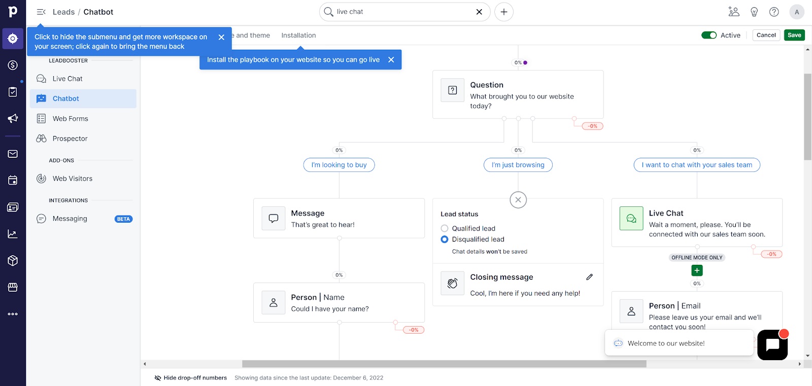Először is vessen egy pillantást a chatbot konfigurációjára, és ellenőrizze, hogy nincs-e hiba a folyamatban. Győződjön meg arról, hogy az áramlás megfelelő és aktiválva van a beállításokban. Ezenkívül vessen egy pillantást az élő csevegés fülre, és ellenőrizze, hogy online állapotban van-e. Az utolsó gyakori probléma, és az egyik legegyszerűbb megoldás, hogy frissítse az oldalt a már integrált élő csevegés widgettel. Ez önmagában az üzenetek nem megfelelő kézbesítését okozhatja, és ez egy könnyen elkerülhető probléma.