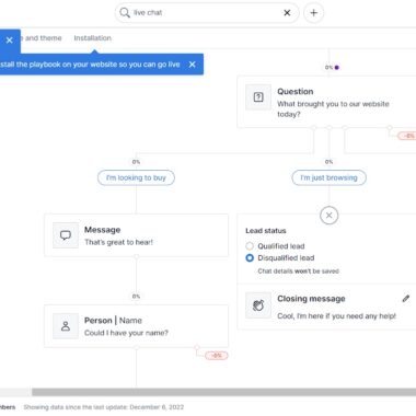 Ami ezután következik, az az áramlási konfiguráció. Mivel ez a PipeDrive specialitása, ezt a folyamatot nem igazán lehet kihagyni; A kezdeti folyamatot az IVR-útválasztáshoz hasonló rendszeren keresztül kell konfigurálnia. Megjelenik az élő chattel automatizálható lehetőségek és műveletek vizuális megjelenítése. Szerencsére, ha úgy dönt, hogy elmenti a változtatásokat anélkül, hogy bármit is konfigurálna, akkor minden rendben lesz, mert a PipeDrive azonnal kínál egy előre meghatározott csevegési folyamatot. Azonban még mindig folyamatban van az automatizálás és nem lehet kikapcsolni. Mellékesen megjegyzem, ez csak a beszélgetés lényegét érinti.